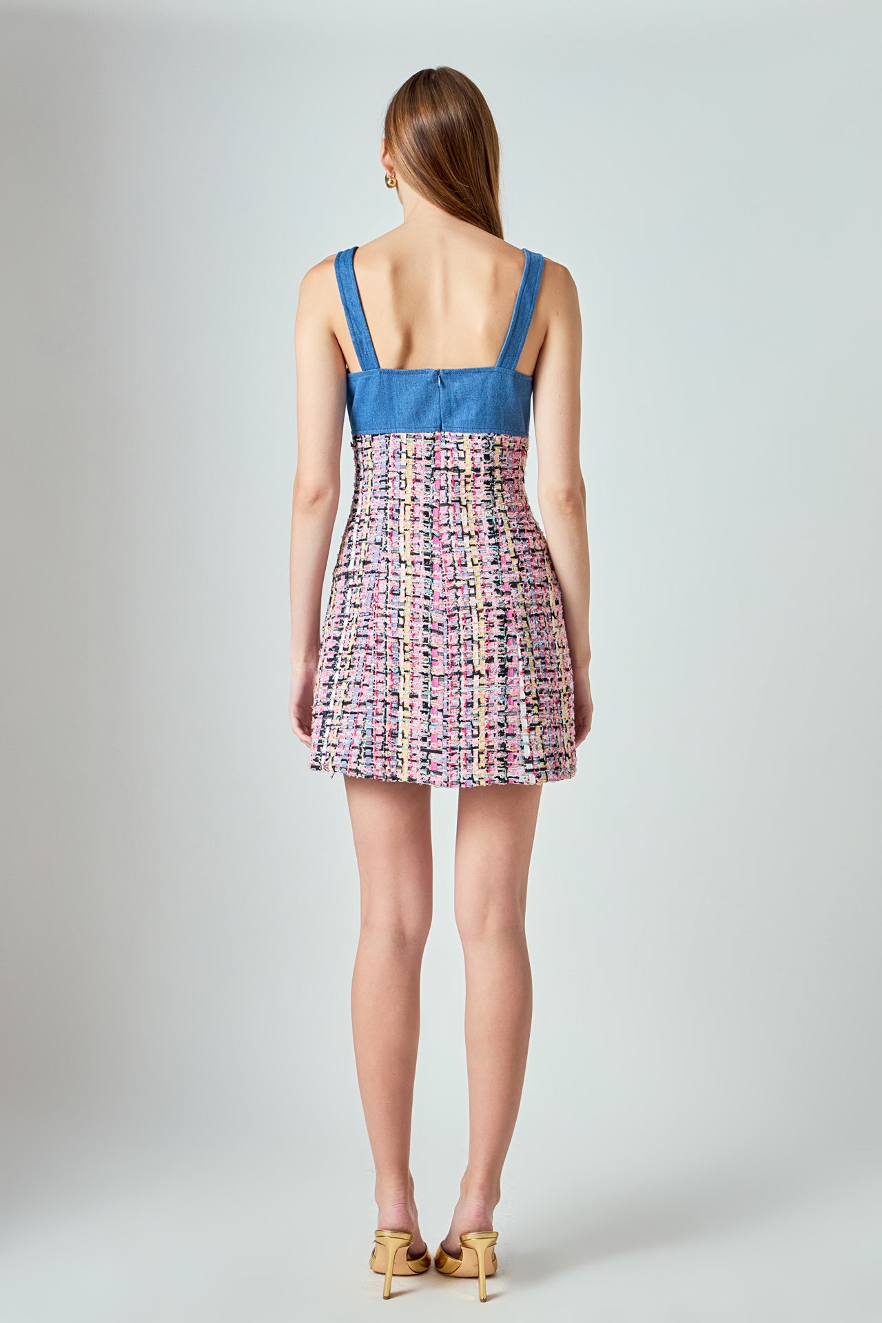 This Tweed Square Neck Dress features a chic squared neckline for a classic look and flattering silhouette. The shoulder strap offers added comfort and support while the back invisible zipper closure ensures a perfect fit. This timeless dress is sure to be a wardrobe staple.