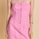 Introducing our must-have Tweed Strapless Mini Dress - the perfect combination of classic elegance and trendy style. The luxurious tweed fabric exudes sophistication, while the strapless design adds a touch of glamour. Featuring front buttons for a chic touch and a mini length for a flirty vibe. This dress is a statement piece that will turn heads at any event. Ideal for any season, it's an essential addition to your wardrobe. Don't miss out on this versatile and fashionable dress. Order now and elevate your style game instantly! Perfect for tweed lovers, this strapless mini dress is a must-have in your collection.