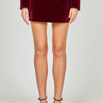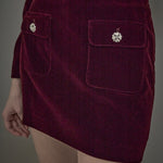 Add some sparkle to your wardrobe with our Velvet Jeweled Button Mini Skirt. This mini features a flattering fitted silhouette with front pockets for a practical touch, while the sparkling jeweled buttons make a statement. The luxe velvet fabric adds richness and depth, and the mini length keeps things flirty and fun. Perfect for dressing up with heels or keeping it casual with sneakers, this skirt is a standout addition to any wardrobe.