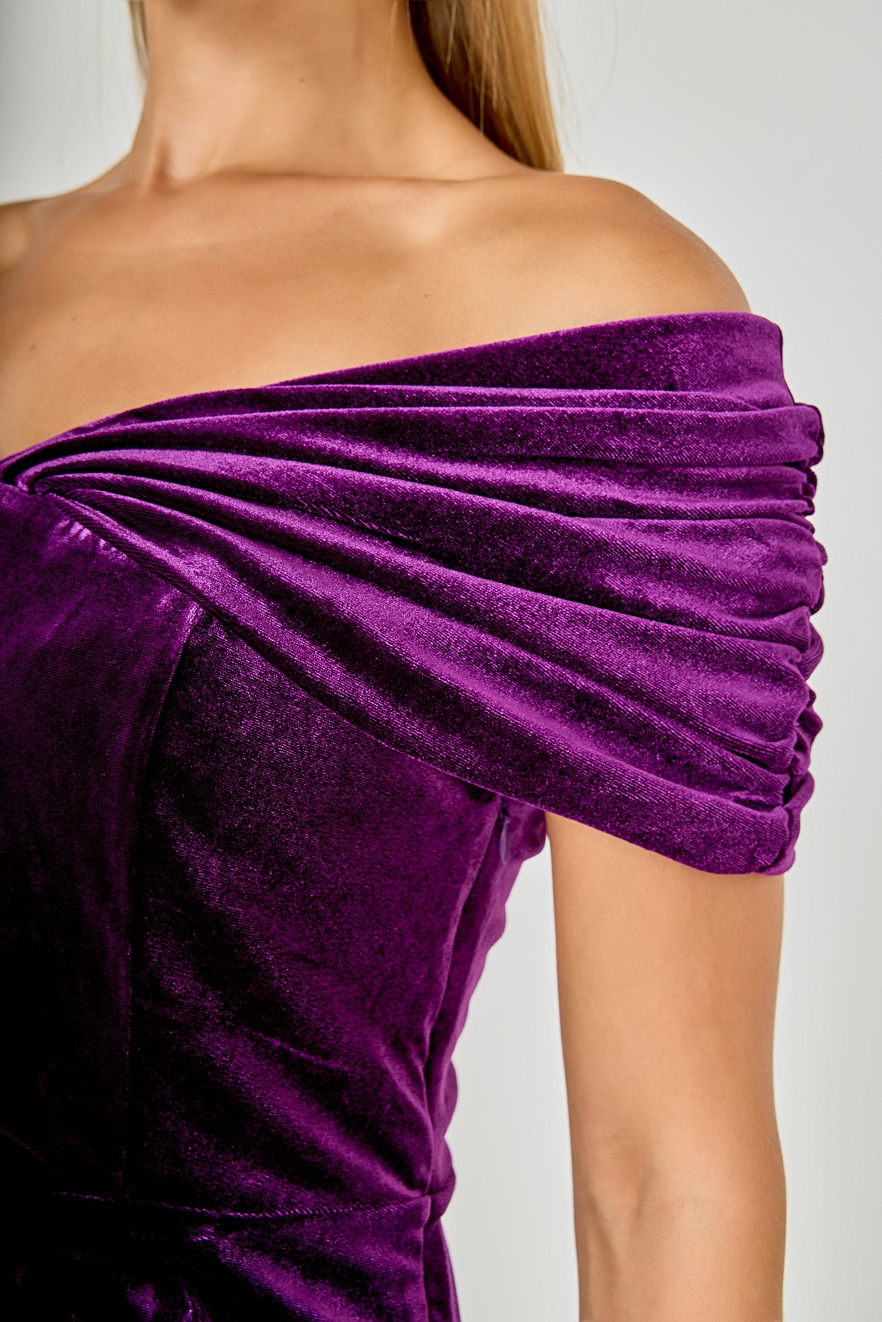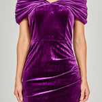 Make a statement in this show-stopping mini dress. In a luxurious velvet fabric, this bodycon dress is designed with a draped off-the-shoulder silhouette and draped drop-shoulder detailing. It falls to a mini length, making it perfect for your next party or night out. Add some strappy heels and statement earrings to complete the look.