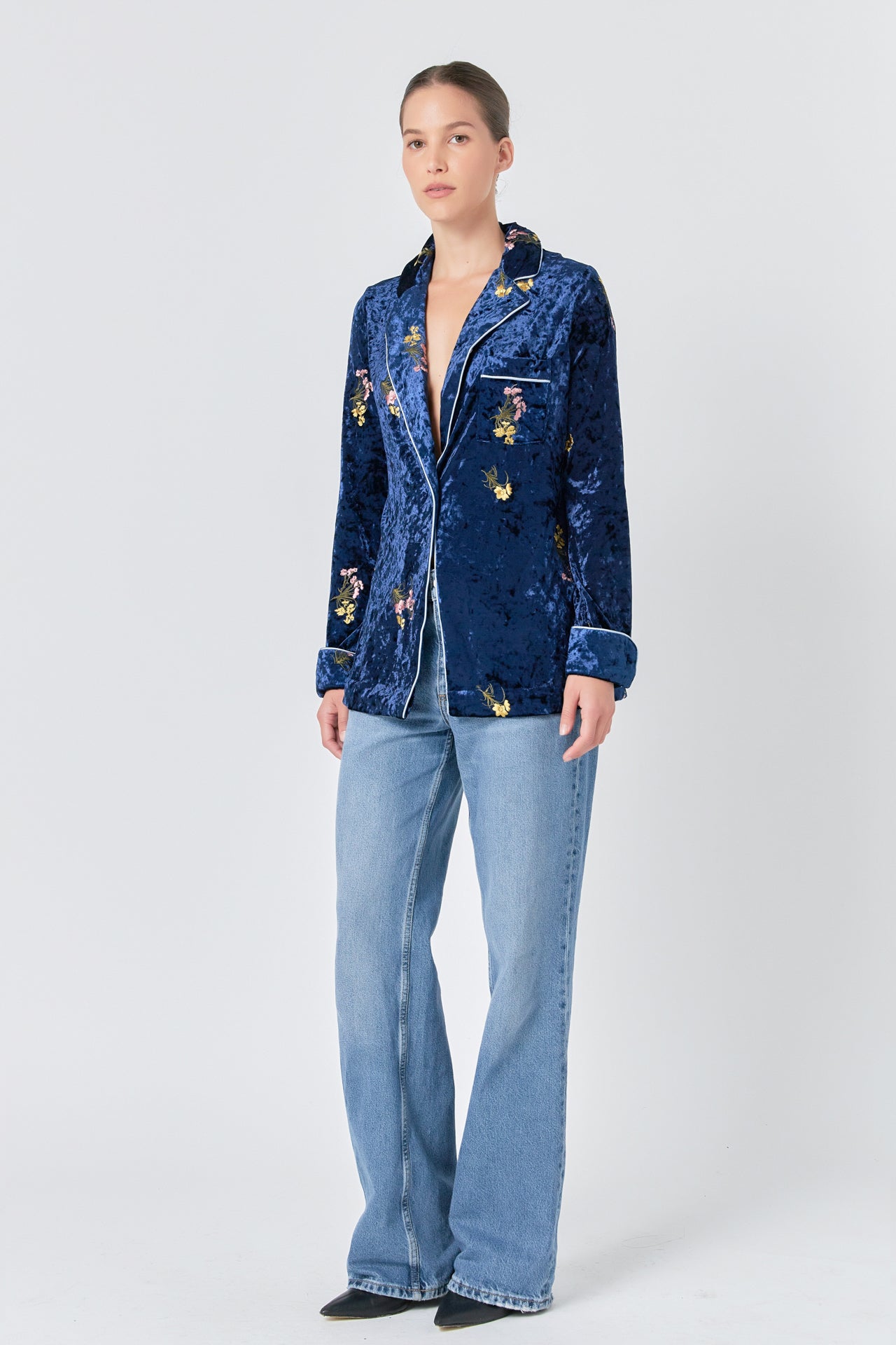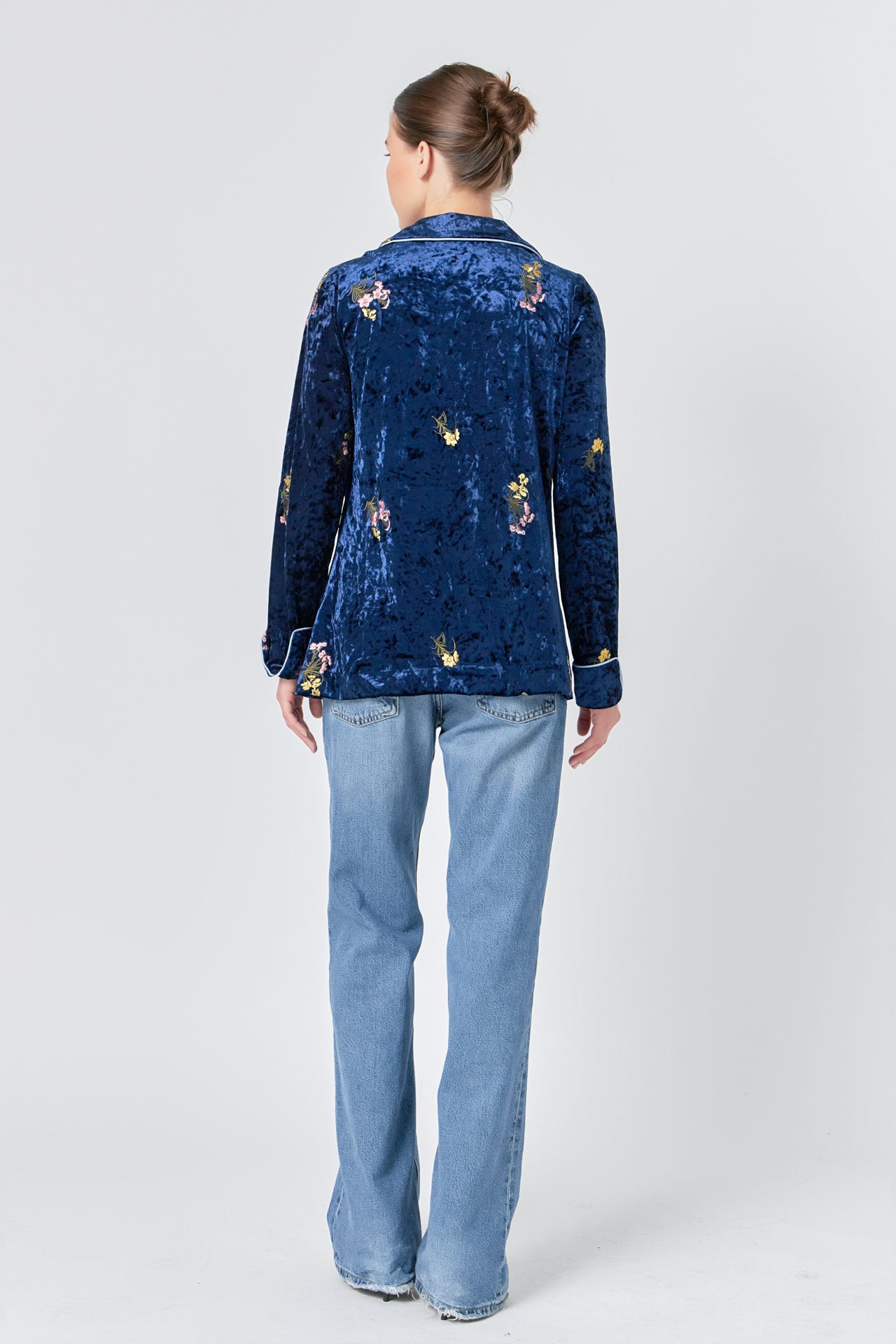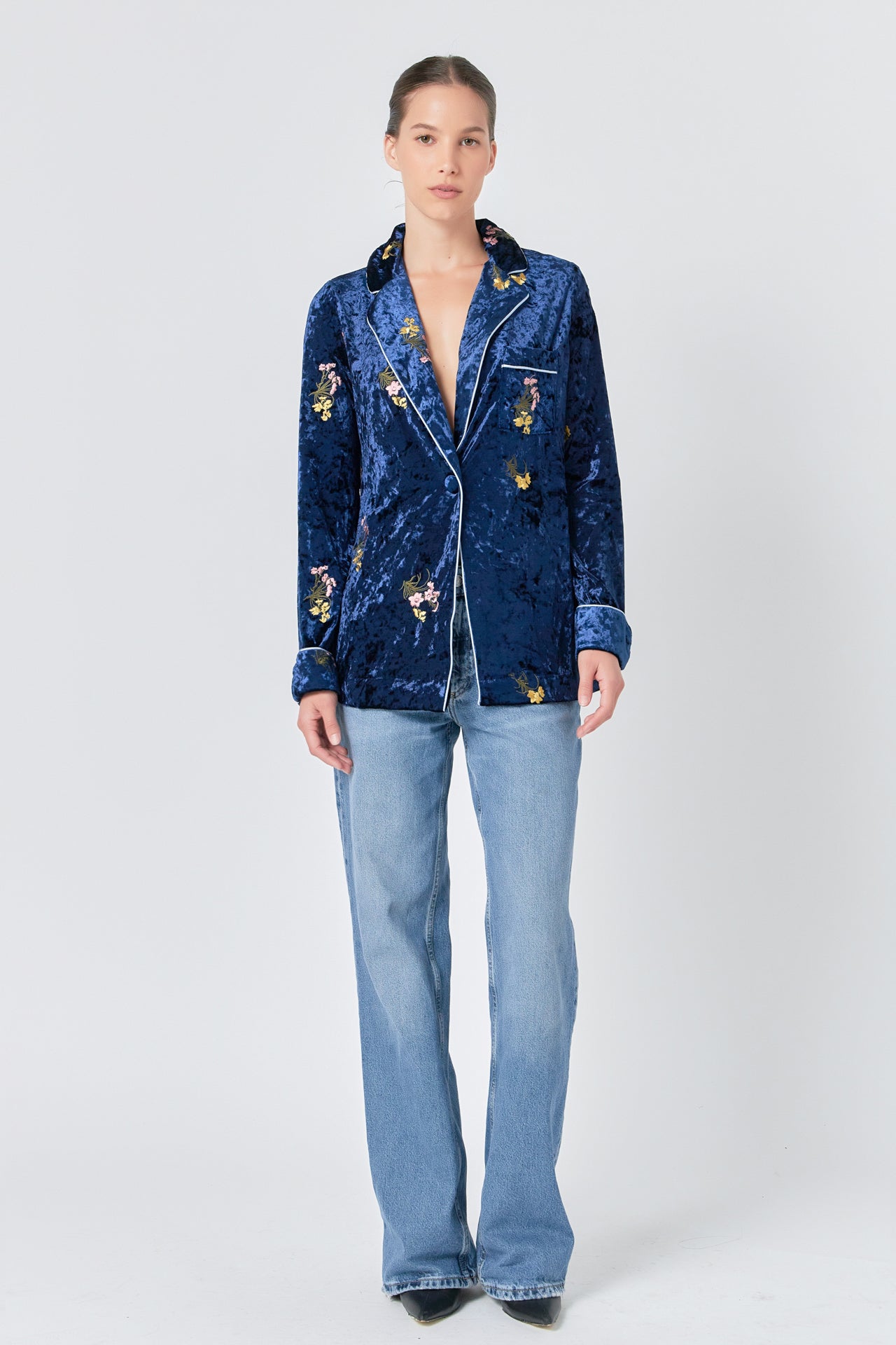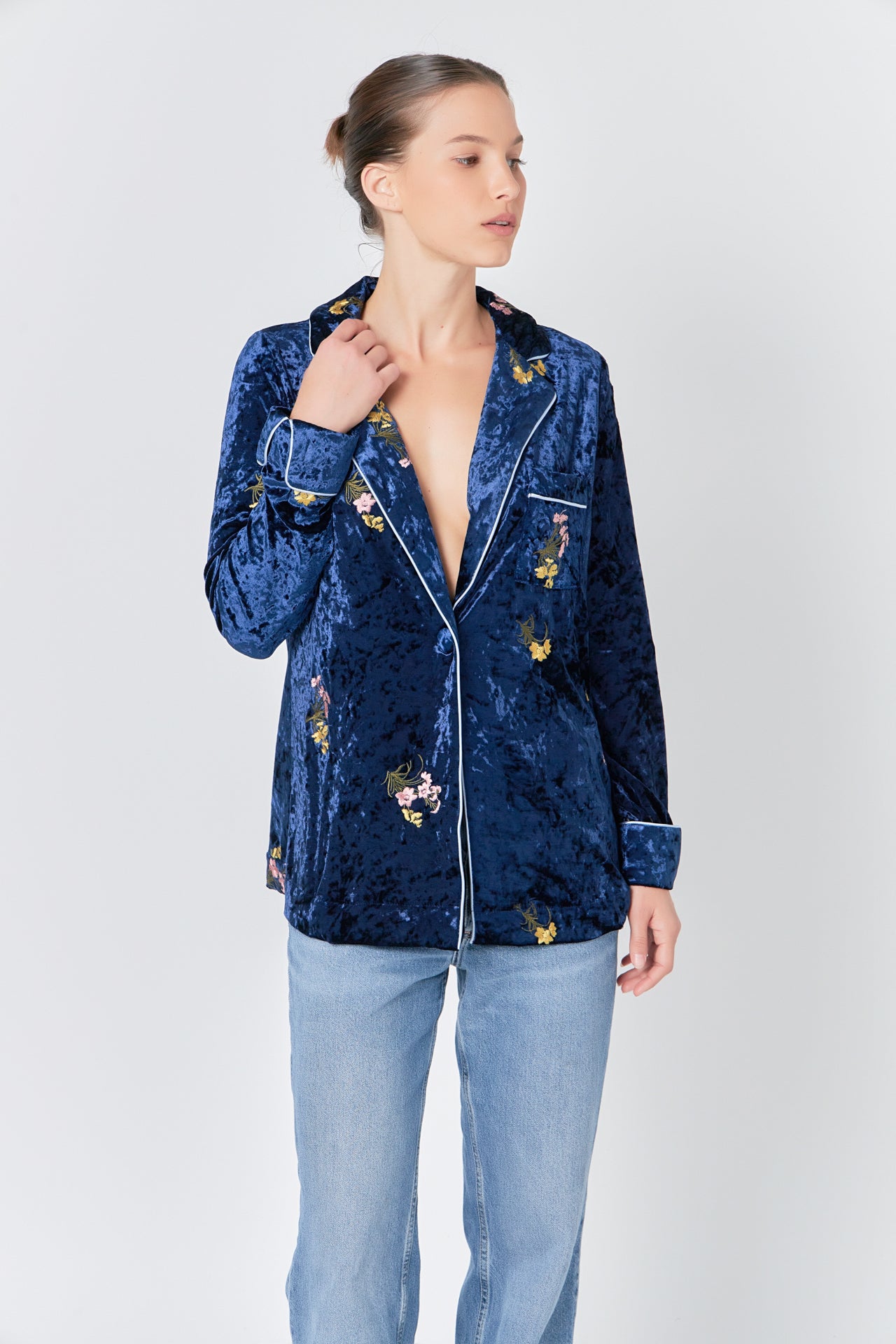 Our Velvet Pajama Jacket is the perfect winter essential. Featuring a stylish floral embroidery, a contrast piping detail, and a welt pocket to keep you warm, this jacket is ideal for keeping cozy while also looking fashionable. The single-button closure adds a special touch of sophistication meaning you can look great all season long.