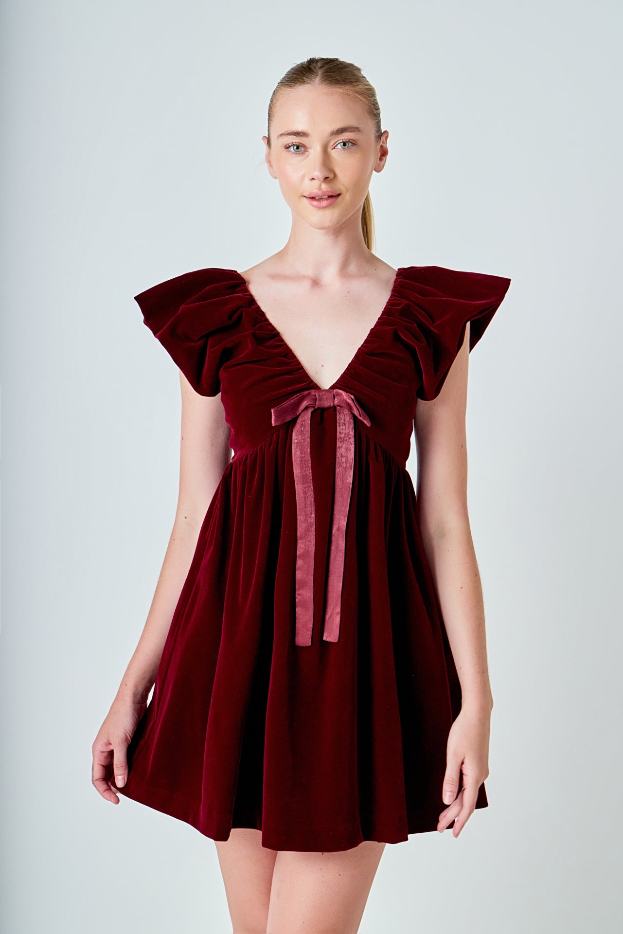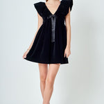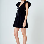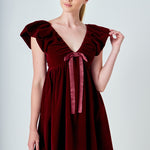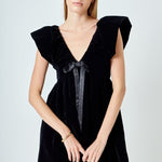 Introducing our luxurious Velvet Satin Bow Mini Dress, the perfect combination of elegance and edge. This mini dress features a plunging V-neckline, adding a touch of sophistication to the playful mini length. The blouson shoulder adds volume and dimension, while the soft velvet material offers a luxurious feel. Whether it's a night out with friends or a special occasion, this dress will surely turn heads. Shop now and stand out from the crowd with our must-have Velvet Satin Bow Mini Dress.
