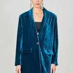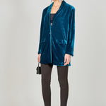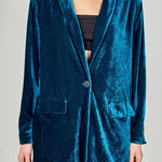 This gorgeous velvet blazer is perfect for any formal occasion. The loose fit allows you to move and breathe freely, and the pocket on the front is perfect for holding your phone or small essentials. The long sleeves and single button closure give this blazer a sleek and polished look that's sure to turn heads.